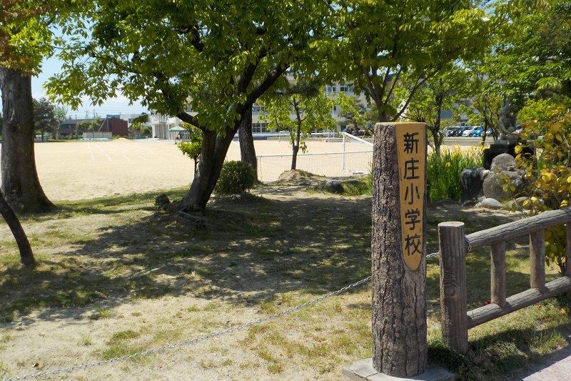新庄城跡は、富山市街地の東約4km、新庄町1丁目地内の新庄小学校の場所にあったと伝えられています。城は、北陸街道沿いの富山と水橋の中間地点、北の東岩瀬や東の大岩、南の上滝・笹津など各方面へ向かう道筋が分岐する交通の要衝ようしょうに位置した平城でした。