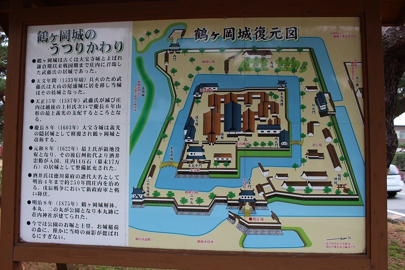城は鶴岡市街地のほぼ中心に位置する。江戸時代は庄内藩の藩庁であった。他の東北地方の城と同様に土塁を多用し、石垣は主要な部分にしか用いられていなかった。また、天守は構えられなかったが、本丸東北隅に2層2階の隅櫓と二の丸南西隅にも2層2階の隅櫓が建てられていた。
