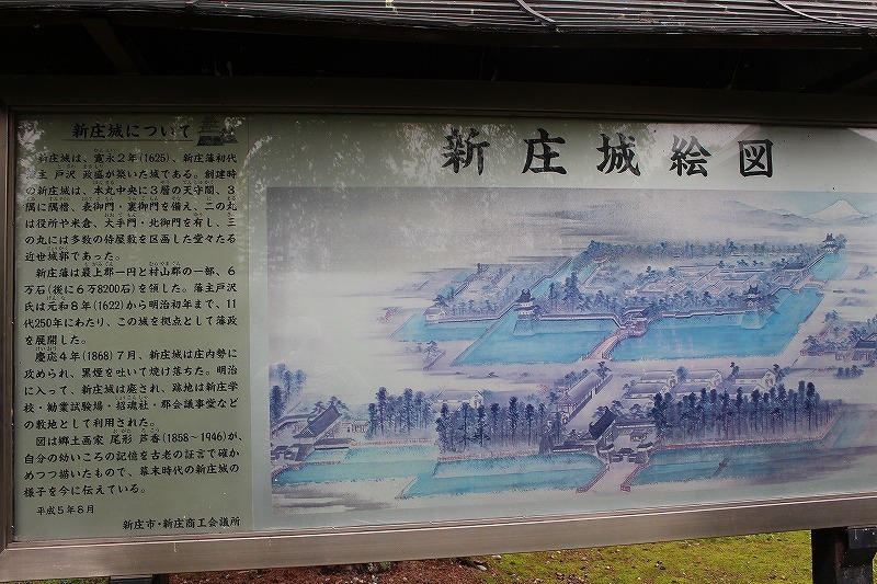 新庄城は、新庄藩6万石(のちに6万8200石)の本拠として寛永2年(1625年)、戸沢政盛により現在の山形県新庄市堀端町に築城された平城。本丸の南側に出丸のように小さな二の丸が並列状に配置され、その外側を三の丸が囲む形である。本丸及び二の丸、三の丸の堀の水は城の北を流れる差指野川(さすのかわ)から引かれた。三の丸堀(二の堀)の反対側に当たる現在の堀端町は、家老などが住む侍屋敷があった。 最上氏改易後に入封した戸沢政盛は当初真室城(鮭延城)に入城したが、手狭であることと、山城のための不便さから幕府に願い出て、当地に築城した。なお、縄張は同一時期に山形城に入封した鳥居忠政によるものである。
