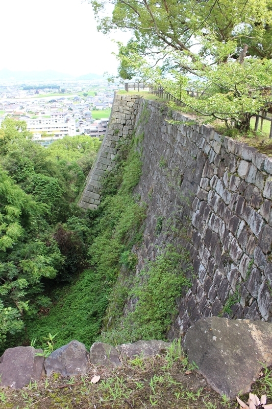 丸亀市街地の南部に位置する亀山(標高66メートル)を利用し、縄張りはほぼ四角形で亀山の廻りを堀(内堀)で囲む、渦郭式の平山城である。石垣は、緩やかであるが荒々しい野面積みと端整な算木積みの土台から、頂は垂直になるよう独特の反りを持たせる「扇の勾配」となっている。山麓から山頂まで4重に重ねられ、合わせると60メートルになり、総高としては日本一高く、三の丸石垣だけで一番高い部分は22メートルある。誤解されやすいが、あくまで総高としての日本一であり、単体としての日本一高い石垣は大坂城で、僅差で上野城が続いている。ちなみに大坂城と上野城の高さは共に約30メートルである。