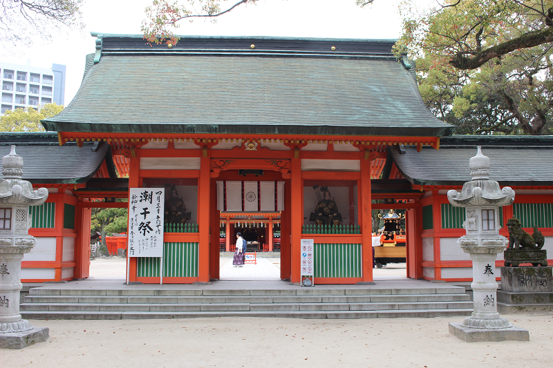 航海の平安・豊漁・陸上交通の安全を祈る祭りです。その昔、海が深く湾入した入江の岬に当社が鎮座されてあったころ、祭の一行は御神輿を乗せた船で出航し、福岡の北に位置する「大築石(おおちくし)・小築石(こちくし)」の側を廻り、荒津の岬(現・西公園周辺)まで船出し、若宮の頓宮(とんぐう)(現・今泉周辺)まで船神幸を行っておりました。その往事を偲び、古式に則り陸路にて御神幸を行っております。
